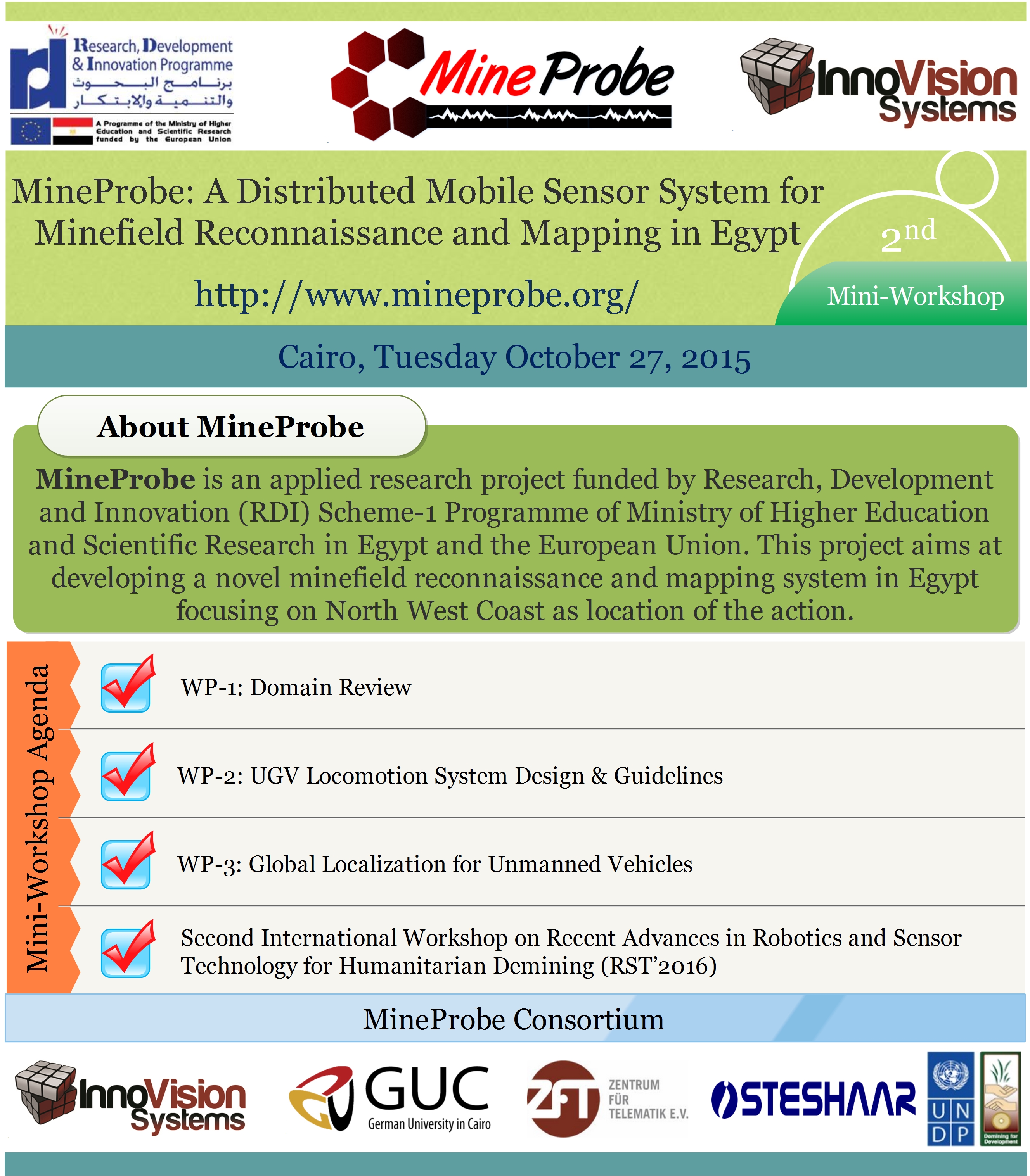 MineProbe workshop will take palce in conjunction with Second International Workshop on Recent Advances in Robotics and Sensor Technology for Humanitarian Demining and Counter-IEDs (RST 2016) to be hosted by Zewail City of Science and Technology in the beautiful city of Cairo, Egypt in October 27-30, 2016. MineProbe workshop is dedicated to present the progress of the different work packages the project.